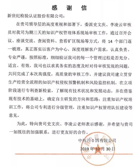 四O四對(duì)認(rèn)證審核工作高度重視、積極配合,順利通過(guò)知識(shí)產(chǎn)權(quán)管理體系的認(rèn)證審核,證書(shū)認(rèn)證范圍是:與核燃料的加工,核設(shè)施退役相關(guān)的知識(shí)產(chǎn)權(quán)管理。在征得公司同意之后,BCC將四O四作為優(yōu)秀貫標(biāo)案例向國(guó)家知識(shí)產(chǎn)權(quán)局進(jìn)行了推薦。