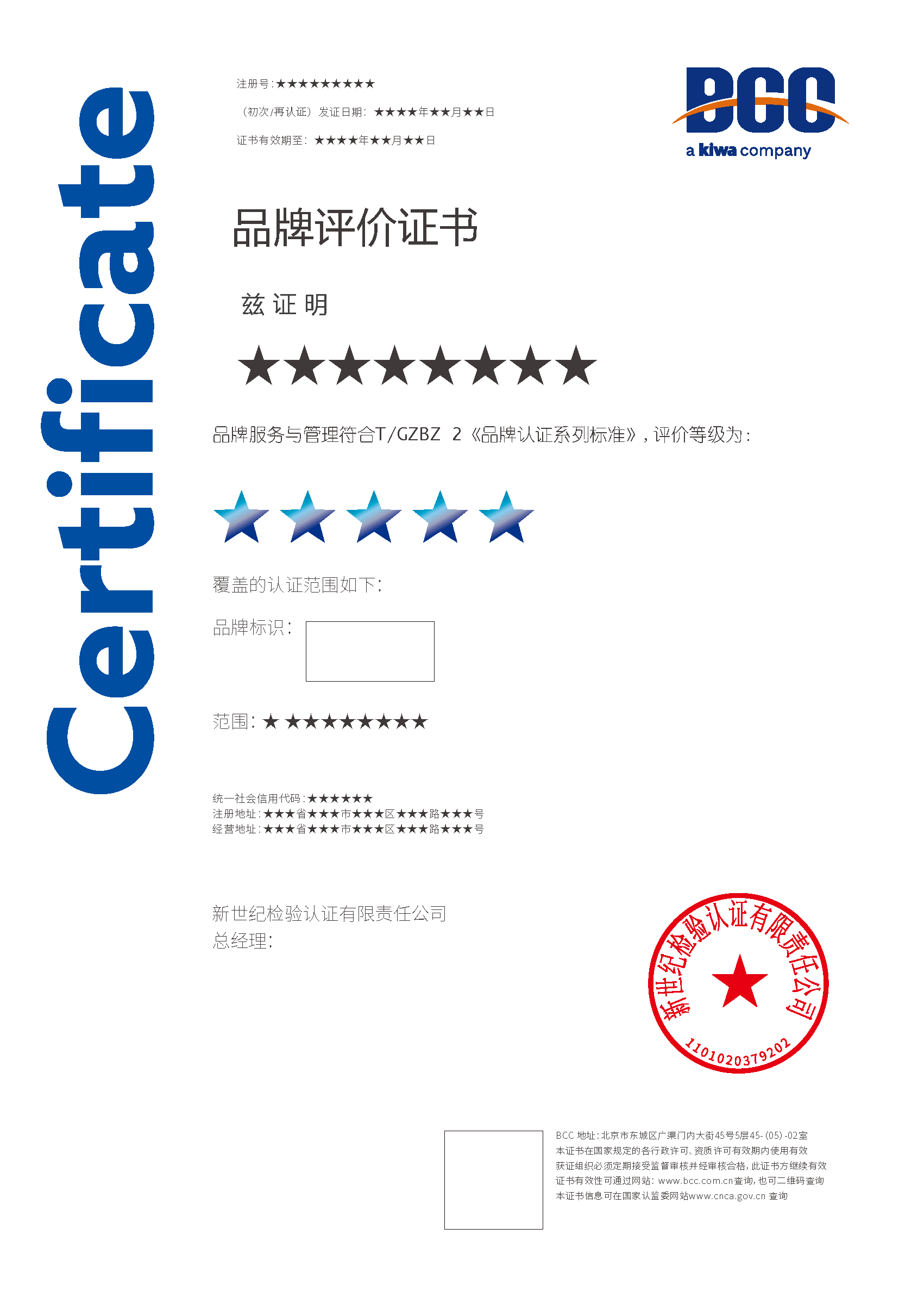 本頁涉及的認證服務中均有對應的《認證實施規(guī)則》,BCC擁有其最終解釋權。任何組織及個人未經(jīng)BCC許可,不得以任何形式全部或部分使用(法律要求除外)認證相關信息。如需獲取相關實施規(guī)則請用以下方式聯(lián)系獲?。弘娫挘?10-58579316 郵箱:fwjs@kiwa.cn