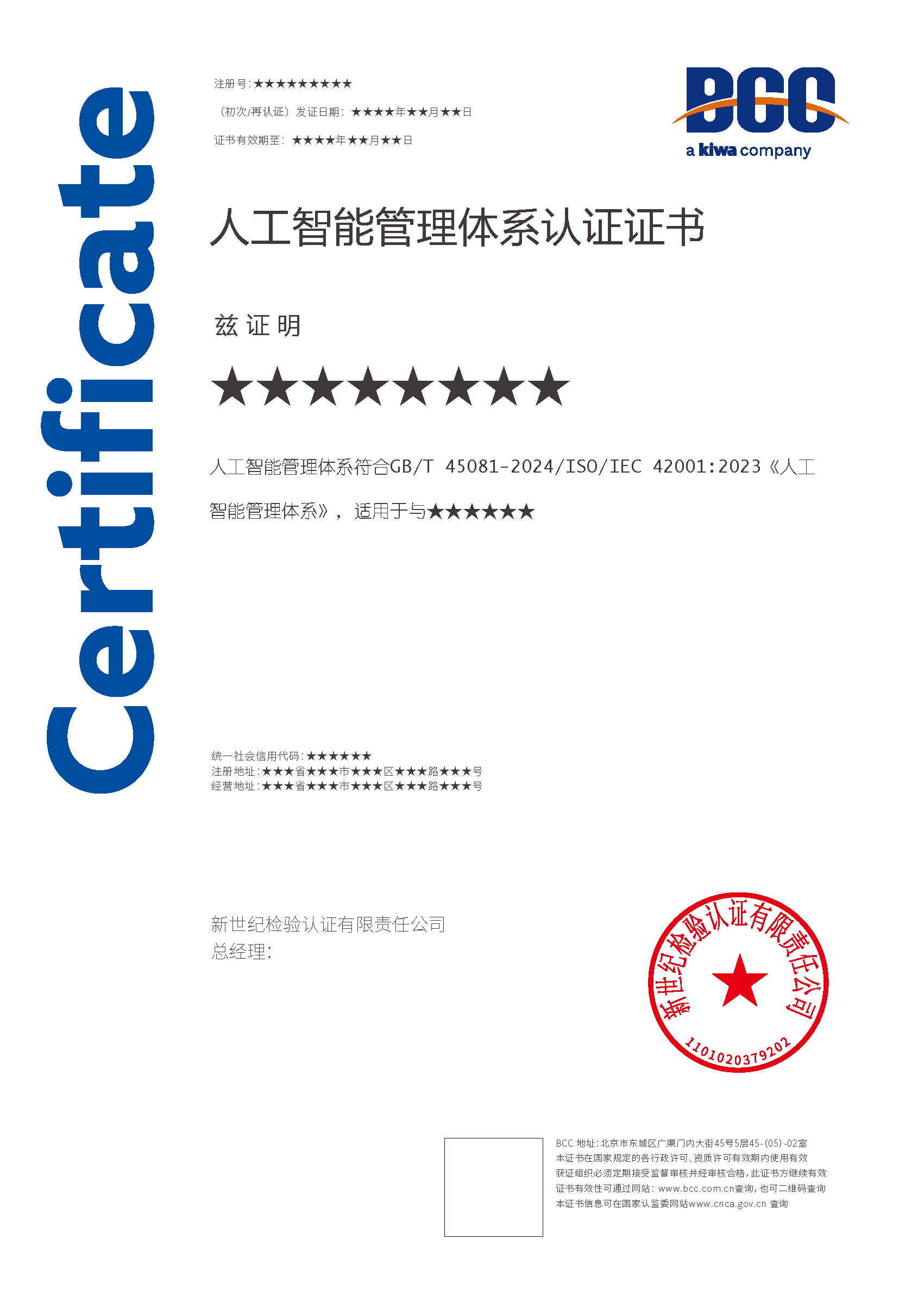 本頁涉及的認(rèn)證服務(wù)中均有對(duì)應(yīng)的《認(rèn)證實(shí)施規(guī)則》,BCC擁有其最終解釋權(quán)。任何組織及個(gè)人未經(jīng)BCC許可,不得以任何形式全部或部分使用(法律要求除外)認(rèn)證相關(guān)信息。如需獲取相關(guān)實(shí)施規(guī)則請(qǐng)用以下方式聯(lián)系獲?。弘娫挘?10-58579316 郵箱:fwjs@kiwa.cn