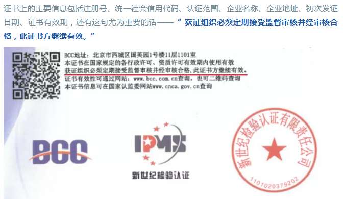 證書上的主要信息包括注冊號、統(tǒng)一社會信用代碼、認(rèn)證范圍、企業(yè)名稱、企業(yè)地址、初次發(fā)證日期、證書有效期,還有這句尤為重要的話——“ 獲證組織必須定期接受監(jiān)督審核并經(jīng)審核合格,此證書方繼續(xù)有效。”