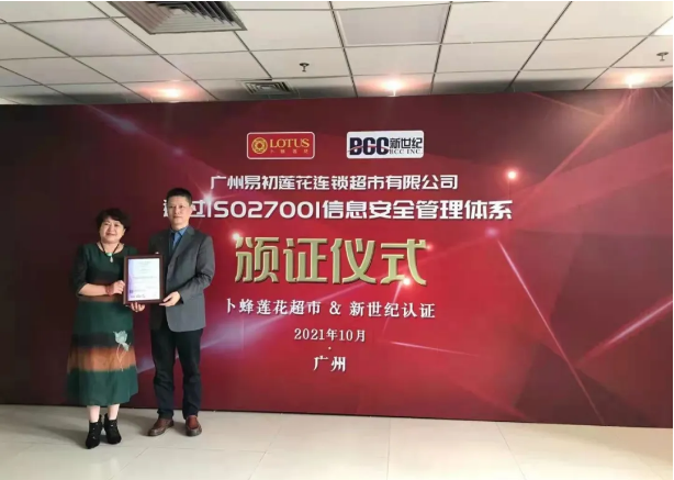 儀式上,李曉杰女士向余嘉璋總監(jiān)頒發(fā)了信息安全管理體系認(rèn)證證書,并對廣州易初蓮花順利獲得認(rèn)證表示熱烈祝賀。
