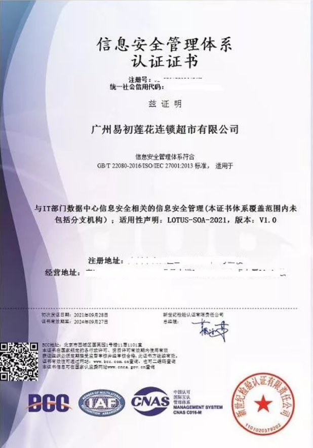 本次獲得BCC頒發(fā)的信息安全管理體系認(rèn)證證書,標(biāo)志著廣州易初蓮花在識別信息安全風(fēng)險,減少可能存在的信息安全隱患,提升員工信息安全意識,實現(xiàn)良性發(fā)展方面又邁進(jìn)一步!