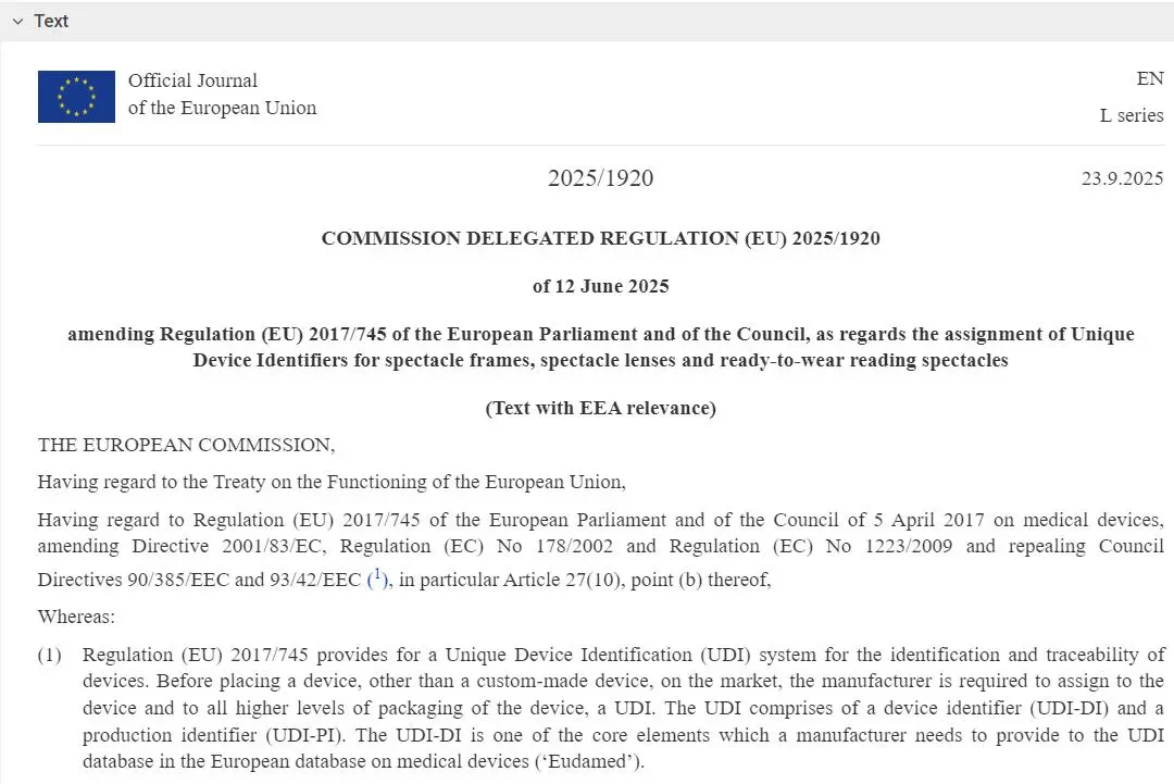 近日,歐盟官方期刊(OJ EU)發(fā)布了《歐盟委員會(huì)授權(quán)法規(guī)(EU)2025/1920》,對(duì)《醫(yī)療器械法規(guī) (EU) 2017/745》(MDR)中關(guān)于眼鏡框架、眼鏡鏡片和即戴式老花鏡的唯一器械標(biāo)識(shí)(UDI)要求進(jìn)行了重要修訂。