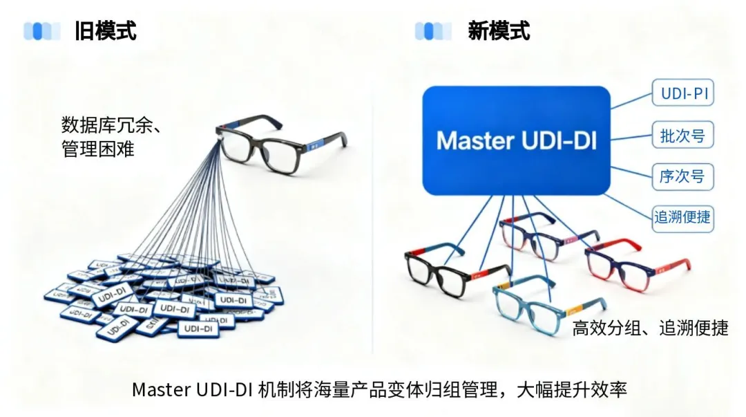 然而,眼鏡框架、眼鏡鏡片和即戴式老花鏡等產(chǎn)品由于存在大量的設(shè)計(jì)參數(shù)和結(jié)構(gòu)變體,同一型號(hào)下可能衍生出海量UDI-DI。按照原有規(guī)則,每個(gè)產(chǎn)品變體都需單獨(dú)分配 UDI-DI,導(dǎo)致同類眼鏡產(chǎn)品的 UDI-DI 數(shù)量激增。