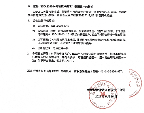 2021年7月1日(含)后通過認(rèn)證決定的,依據(jù)本告知書第四條款通過專項(xiàng)轉(zhuǎn)換評(píng)估后,經(jīng)評(píng)估符合要求的,頒發(fā)依據(jù)“ISO22000:2018”的認(rèn)證證書;經(jīng)評(píng)估不符合要求的,頒發(fā)BCC機(jī)構(gòu)證書;