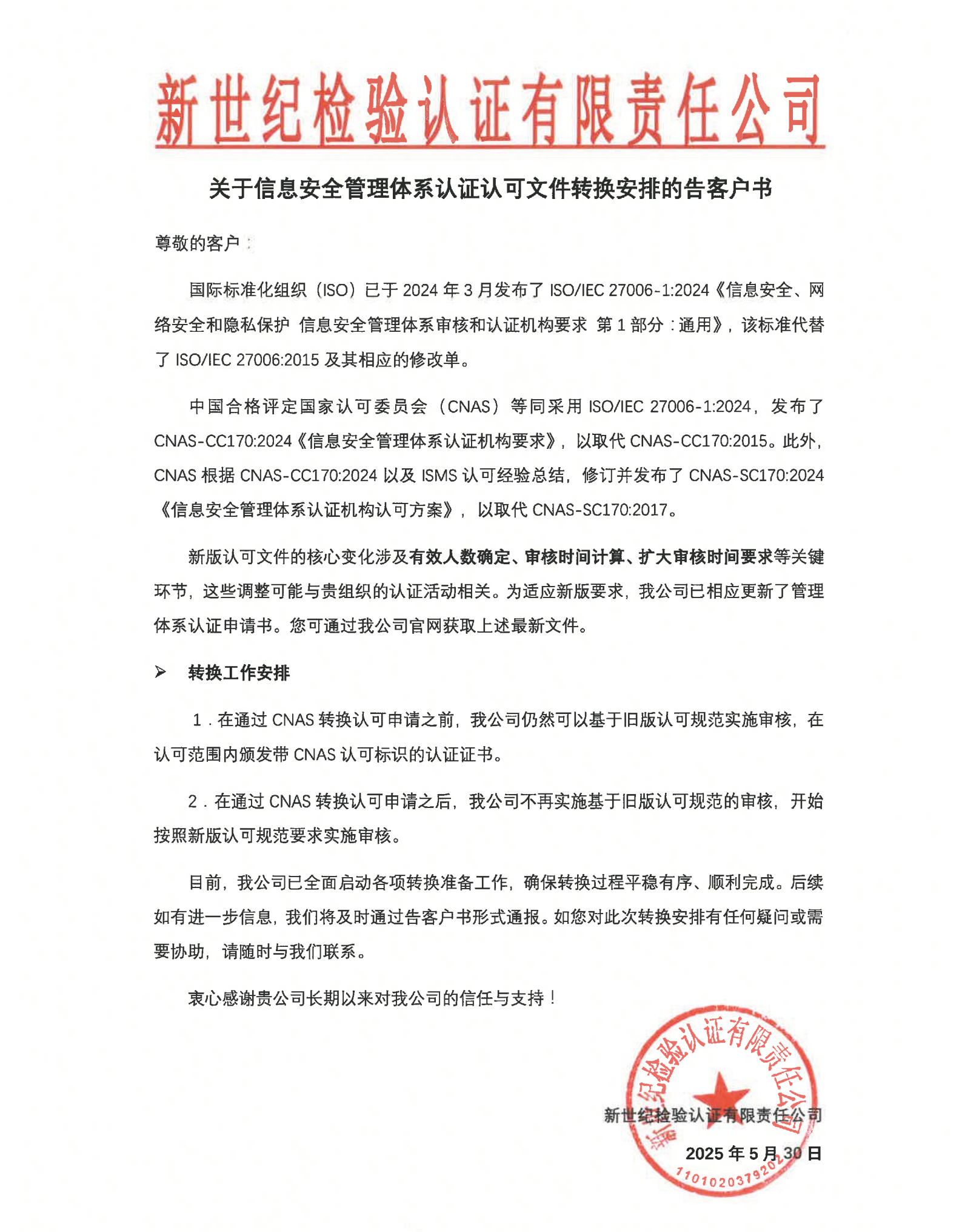 關(guān)于信息安全管理體系認(rèn)證認(rèn)可文件轉(zhuǎn)換安排的告客戶(hù)書(shū)